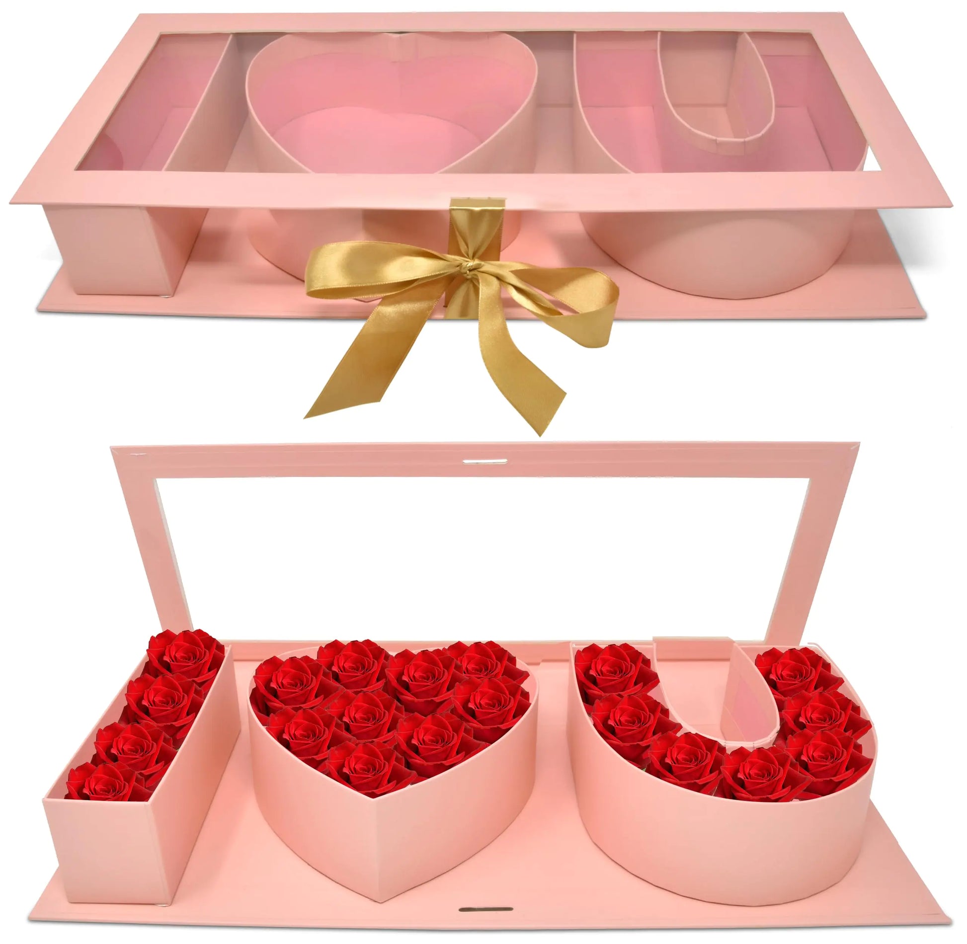 ["Elegant Design: Classic pink I Love You letter shaped gift box features a plastic liner window and a gold bow ribbon to tie it closed with the words I heart U; ideal for a DIY favorite gift for Valentines Day" "High Quality: Made of premium sturdy and durable card board material that will last year after year; no assembly needed; no wrapping needed with our gift boxes its quick and easy; you can just fill it tie it and present it" Dimensions: Gift Boutique pink Valentines flower gift boxes includes a set of 1 that measures 18" x 2.7" x 7.7"; the perfect size with enough space for packing your special gifts to your loved one "Multiple Use: Versatile for mothers day Valentines Day proposals bridal showers engagements weddings birthdays anniversaries housewarming parties; you can fill them with roses flowers candies chocolates strawberries snacks jewelry and small presents giving a surprise to your girlfriend wife mother daughter" "Great Gift: Holiday season means festive decorations and plenty of refreshments so ensure your homemade goodies or chocolates are protected with this pretty gift box set; your friends family neighbors and coworkers wont be able to wait to open your gifts"]